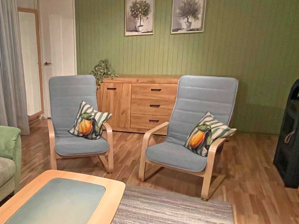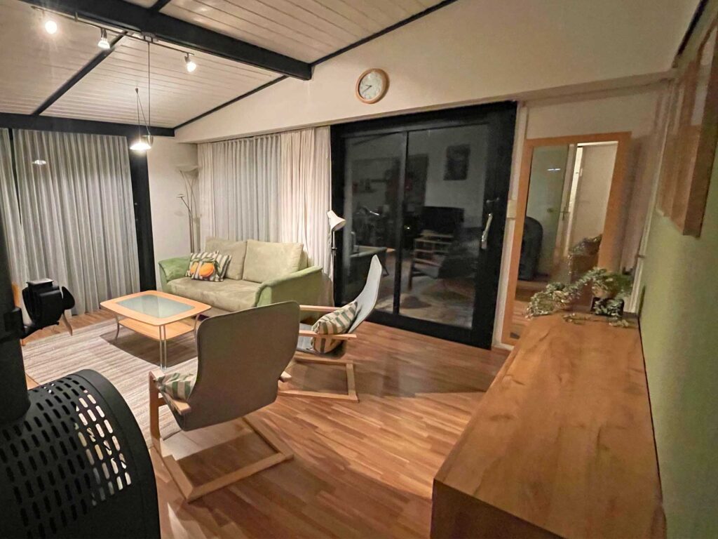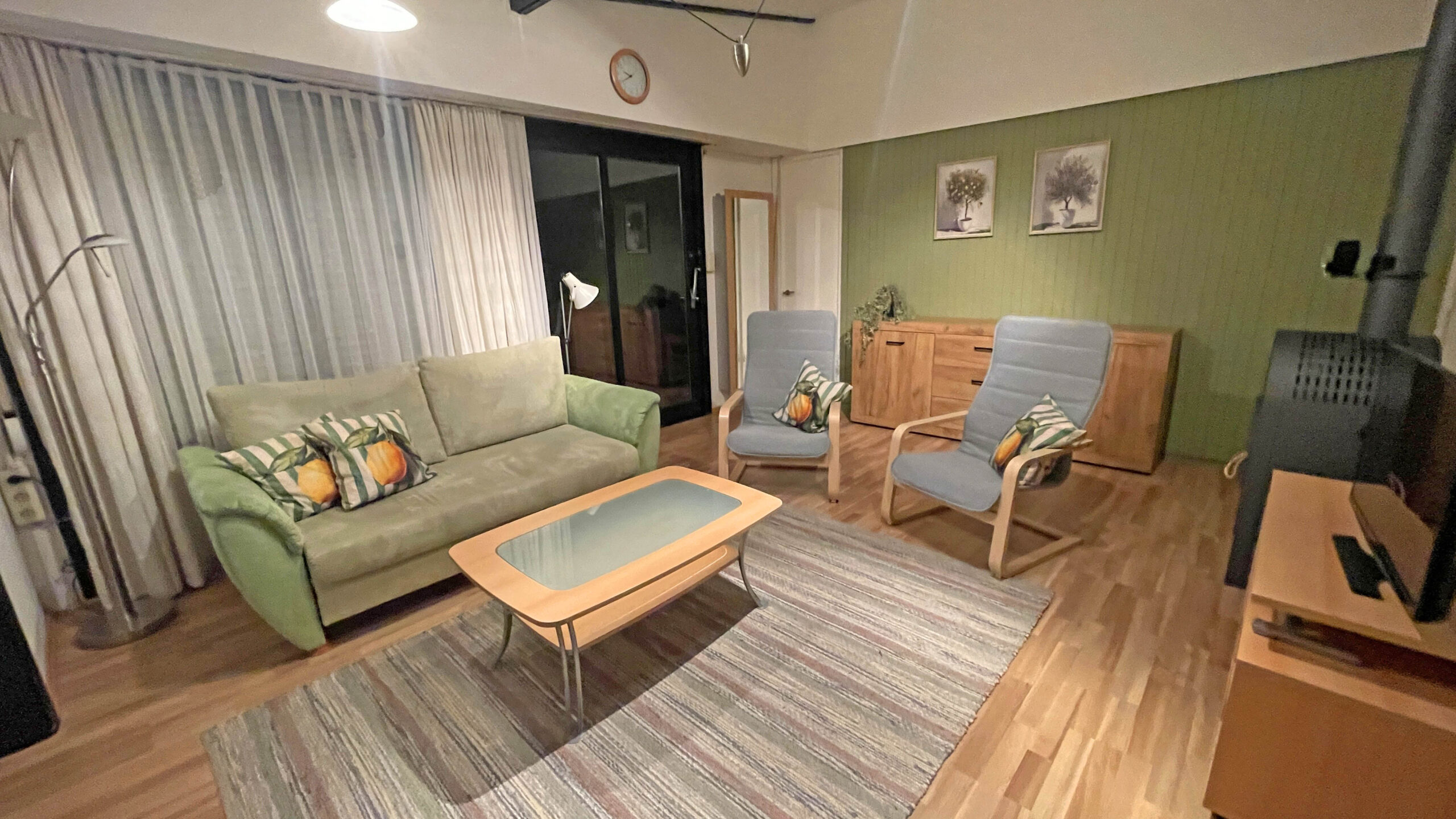 De woonkamer beschikt over een salontafel, bank, stoelen, eettafel, dressoir met spellen en leesmateriaal.