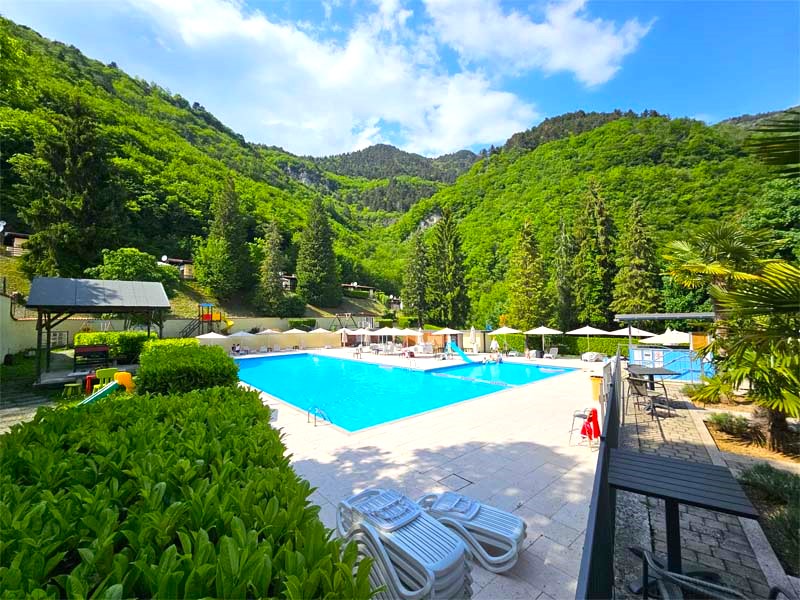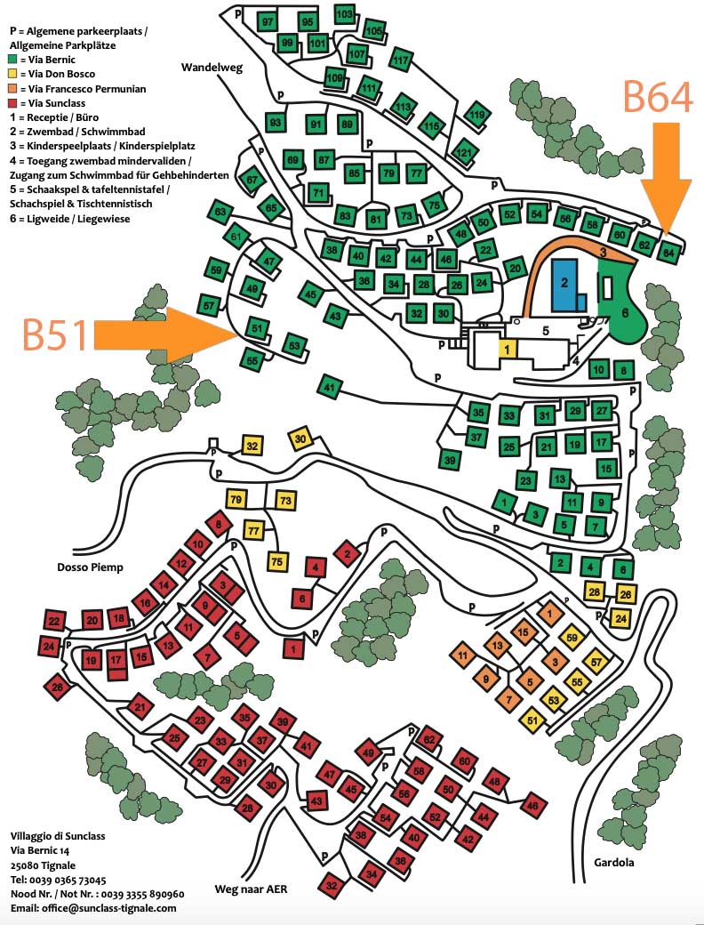 De vakantiehuisjes B51 en B64 liggen op een vakantiepark en zijn tegen een berg gebouwd. Vanaf het park heeft u een prachtig uitzicht op het meer en het tegenoverliggende gebergte van de Monte Baldo. Het park bevindt zich circa 600 meter boven het Gardameer en grenst aan het gigantische natuurpark “Parco Alto Garda“. Het is een heerlijk relaxt vakantiepark met de nodige faciliteiten voor jong en oud.Â